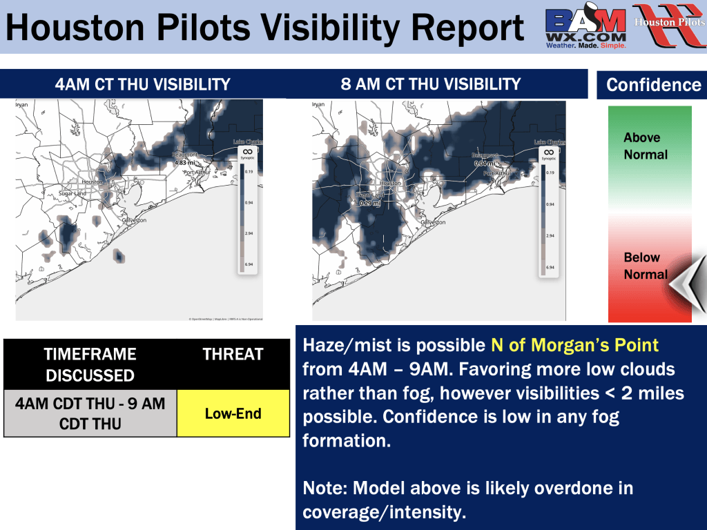 Good Thursday AM! Here is your latest Houston Pilots Forecast Package/Visibility Update! If you have any forecast questions, please do not hesitate to reach out via our on call phone number (317)-560-8122, option 1.