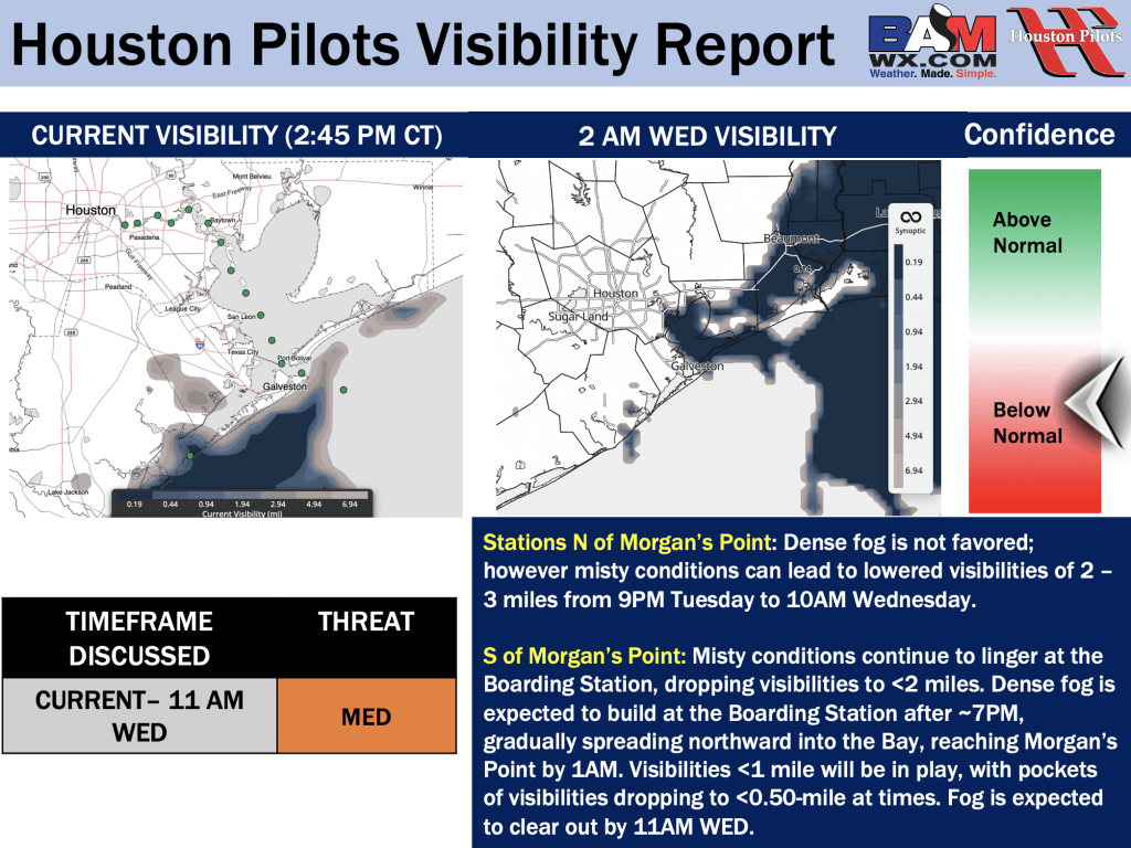 Good Tuesday PM! Here is your latest Houston Pilots Forecast Package/Visibility Update! If you have any forecast questions, please do not hesitate to reach out via our on call phone number (317)-560-8122, option 1.
