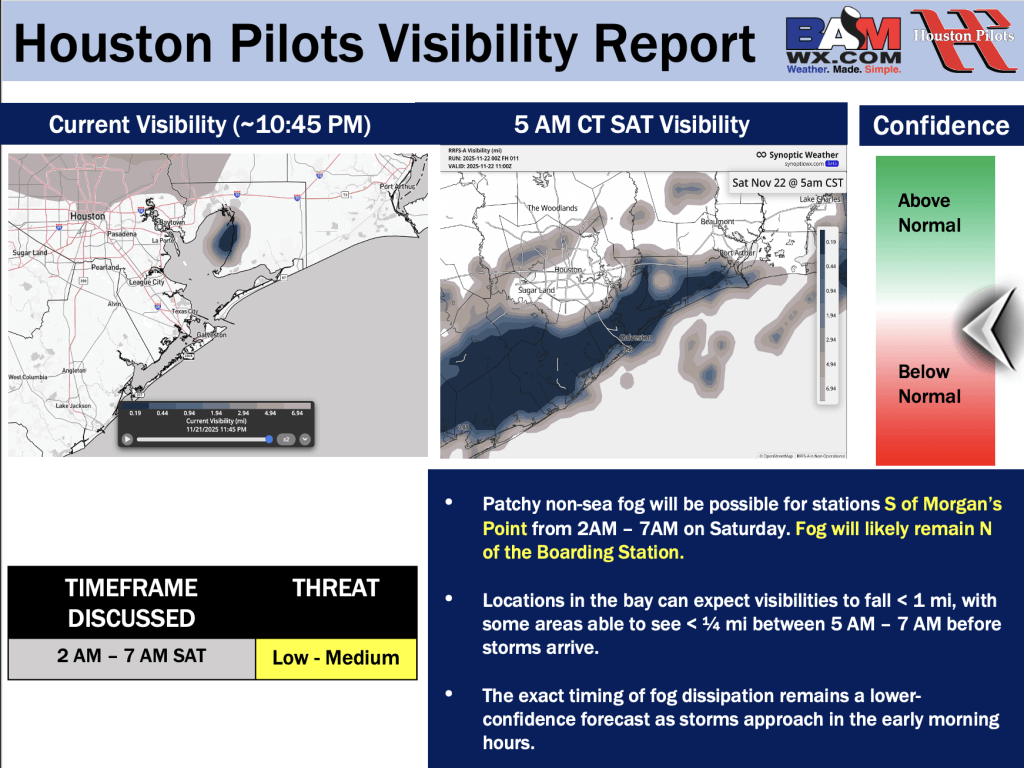 Good Saturday AM! Here is your latest Houston Pilots visibility update! If you have any forecast questions, please do not hesitate to reach out via our on call phone number (317)-560-8122, option 1.