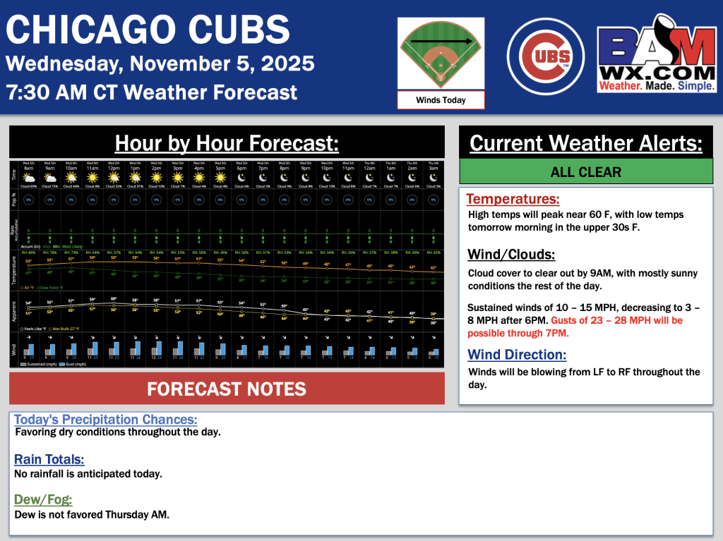 11-5-25 Chicago Cubs Forecast Update.H. By Hope KleitschOn November 5, 2025 Good morning! Here is your latest Chicago Cubs forecast update. Please reach out with any questions! PDF: Chicago Cubs