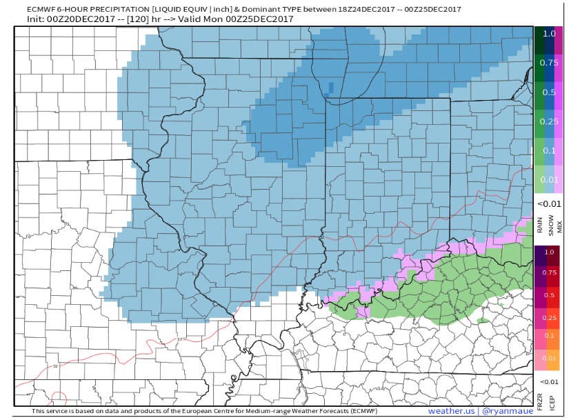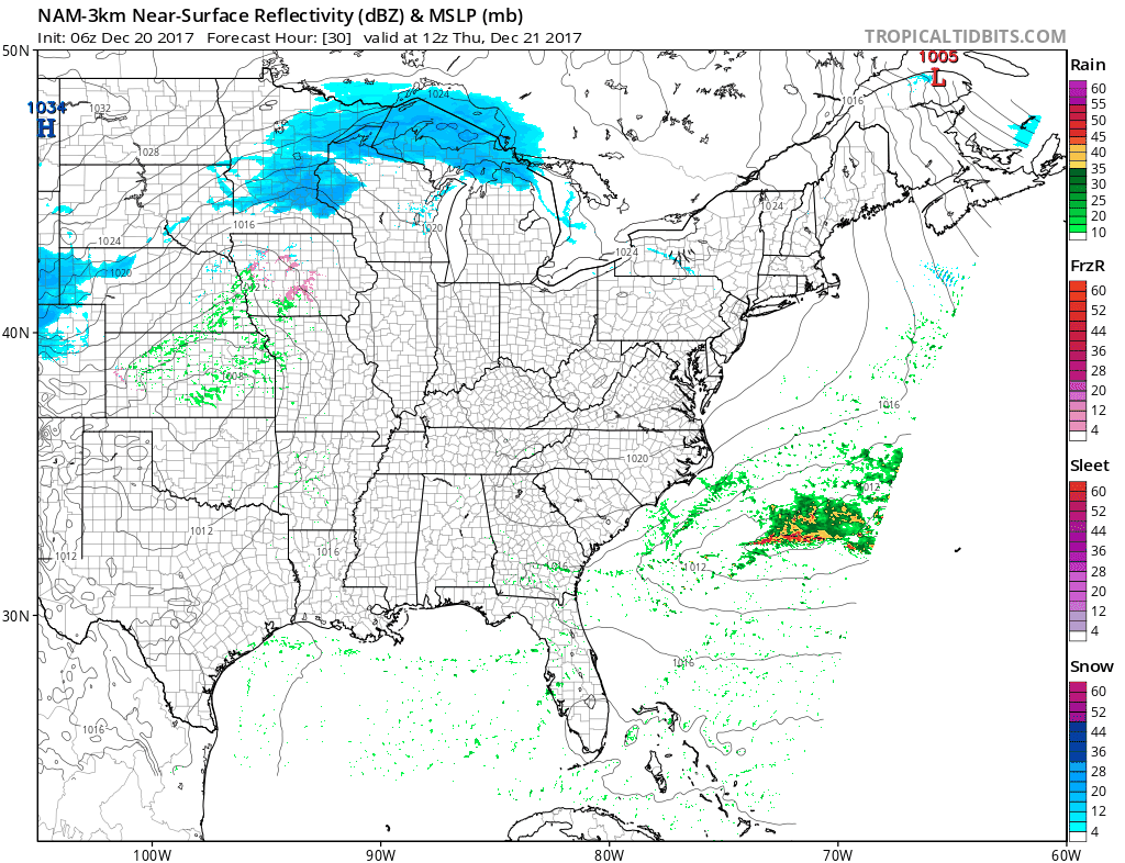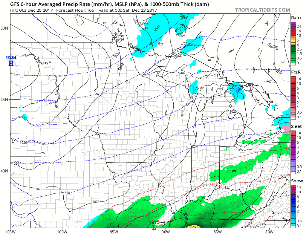 Another wave of snow showers is possible on Christmas Eve with some snow accumulation possible. The European model is more aggressive with snow potential for northern parts of the state, while the GFS remains the outlier keeping it dry. We think the European is the more likely scenario given that all models show the upper-level energy aloft. Forecast radar Christmas Eve afternoon shown below: