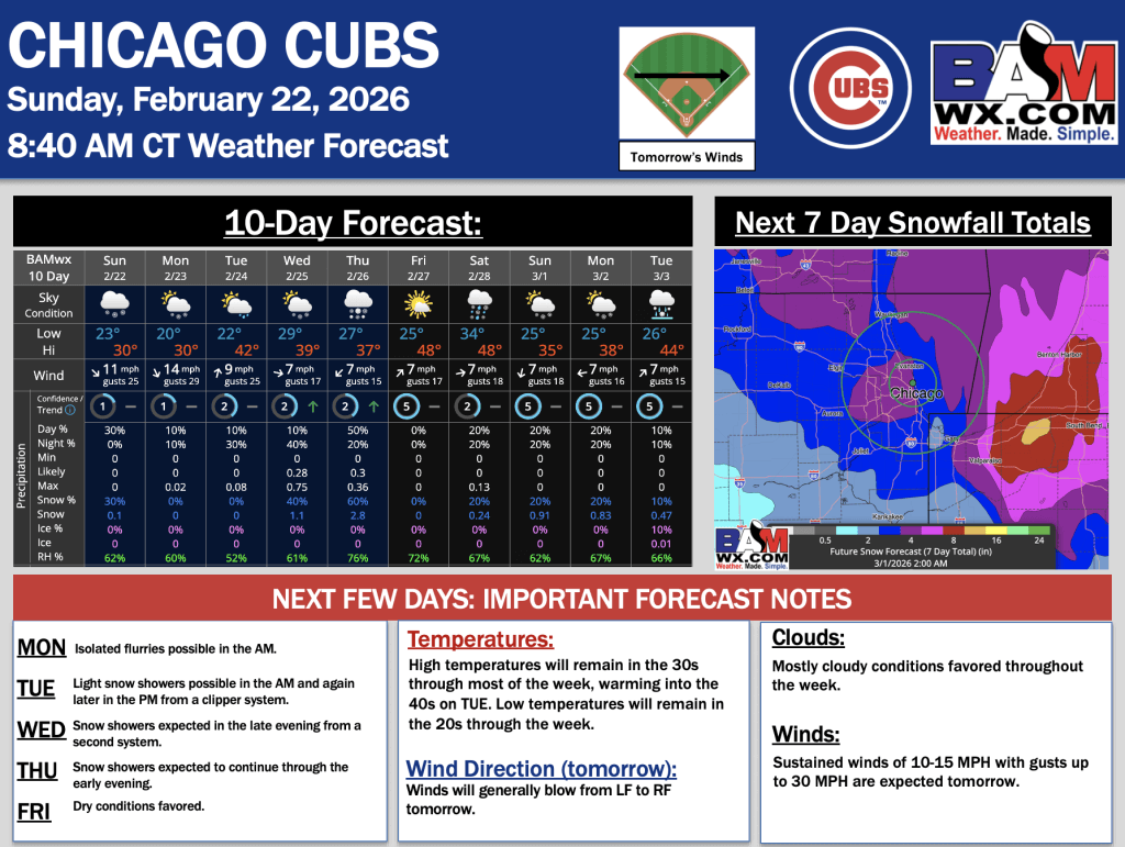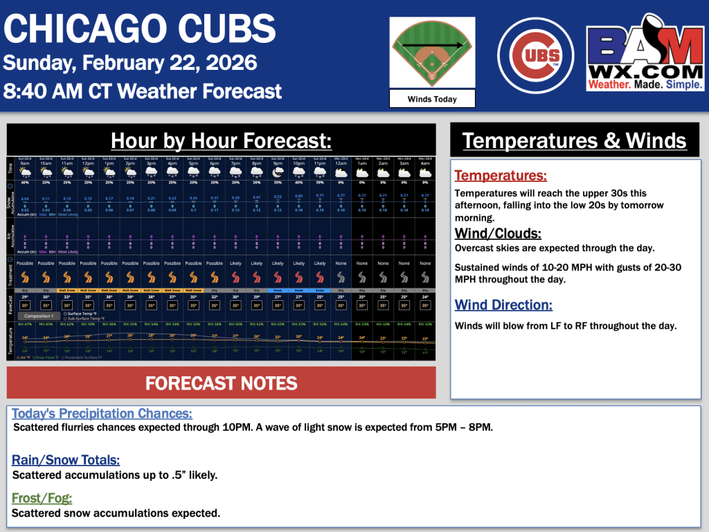 2-22-26 Chicago Cubs Forecast Update.S. By Samantha LangOn February 22, 2026 Good Morning! Here is your latest Chicago Cubs forecast update. Please reach out with any questions! PDF: Chicago Cubs