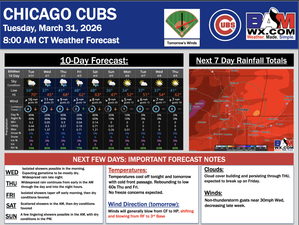 3-31-26 Chicago Cubs Forecast Update. D. By Daniel MurphyOn March 31, 2026 Good morning! Here is your latest Chicago Cubs forecast update. Please reach out with any questions! PDF: Chicago Cubs