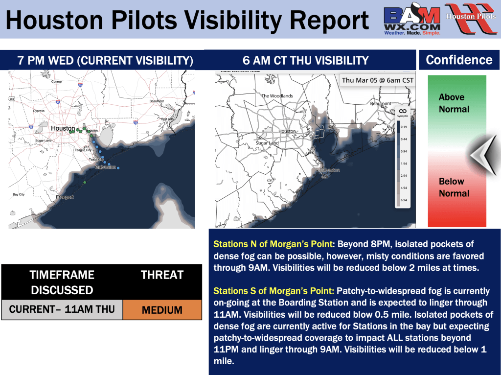 Good Wednesday PM! Here is your latest Houston Pilots Forecast Package/Visibility Update! If you have any forecast questions, please do not hesitate to reach out via our on call phone number (317)-560-8122, option 1.
