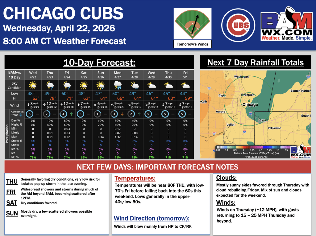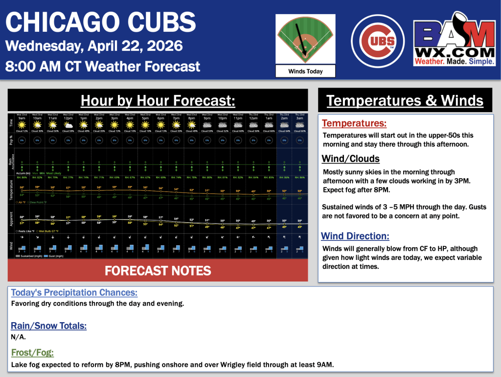 4-22-26 Chicago Cubs Forecast Update. J. By John KemperOn April 22, 2026 Good morning! Here is your latest Chicago Cubs Forecast Update. Please reach out with any questions! PDF: Chicago Cubs