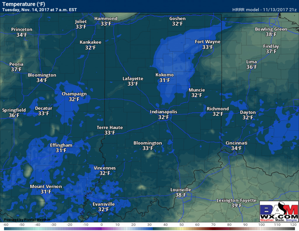 Good evening. Quick update regarding the possibility of some localized freezing fog overnight. Our short term data continues to hint at reduced visibilities along with temperatures hovering around freezing. This may lead to some slick spots via freezing fog and freezing mist. Here’s a look at our top 2 high resolution models early tomorrow morning.